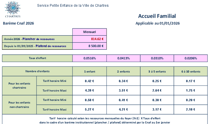 La Caisse d'Allocations familiales d'Eure-et-Loir est partenaire financier des établissements Petite enfance. La tarification est alors déterminée par le barème de la Caisse nationale d'Allocations familiales (prestation de service) avec un plancher et un plafond mensuel.